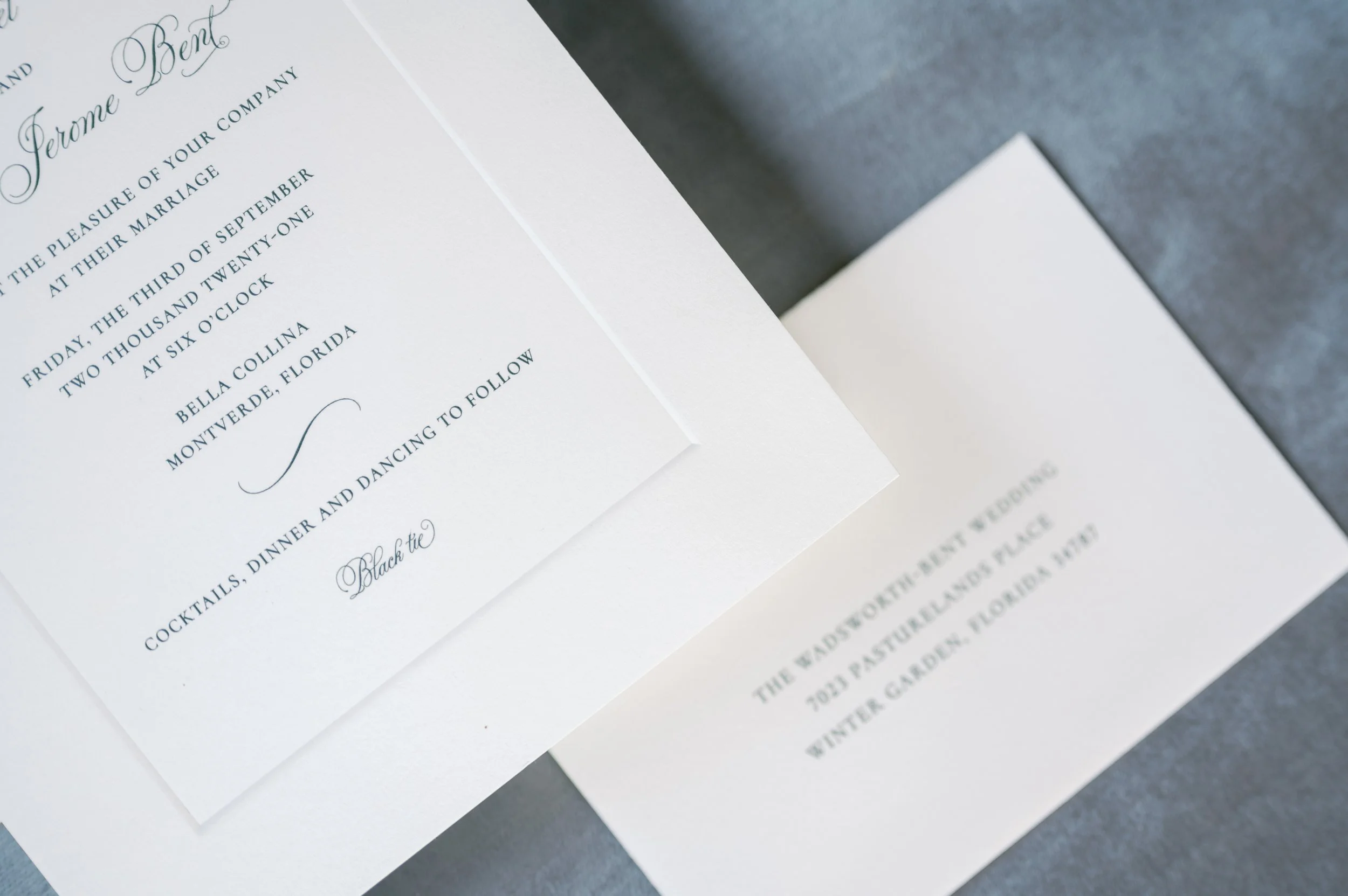 There's a myriad of special embellishments that can elevate wedding stationery to create a unique and luxurious feel. Some of our most popular options include silk ribbon, die-cut shapes, embossing and foil stamping. We can also add beautiful letterpress printing, cotton deckled edge papers and so much more. These embellishments can be mixed and matched to create wedding stationery that reflects the couple's style, personality, and the overall theme of their celebration.